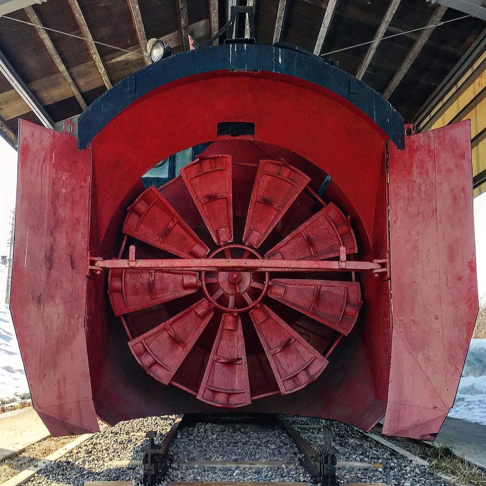 大山祇神社へと続く県道339号を走っていると、道路脇に展示されていた「ラッセル雪カキ車」の異様な迫力に目が留まりました。ラッセル雪カキ車は北海道、東北、北陸、新潟などの雪国で活躍し、この車輌は主に信越線、磐越西線で雪との闘いに明け暮れたそうです。回転翼に飲み込まれたらひとたまりもなさそうです。